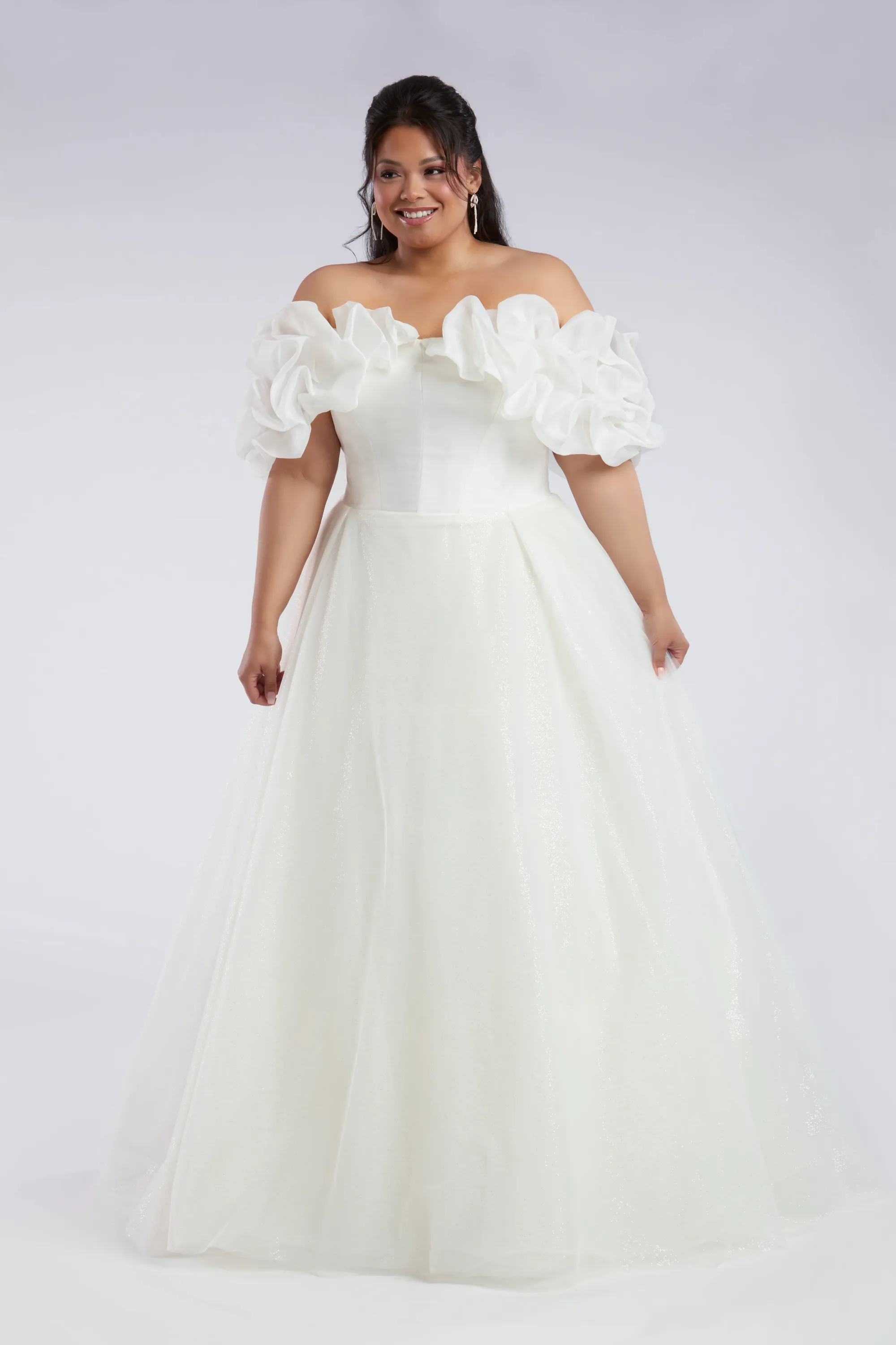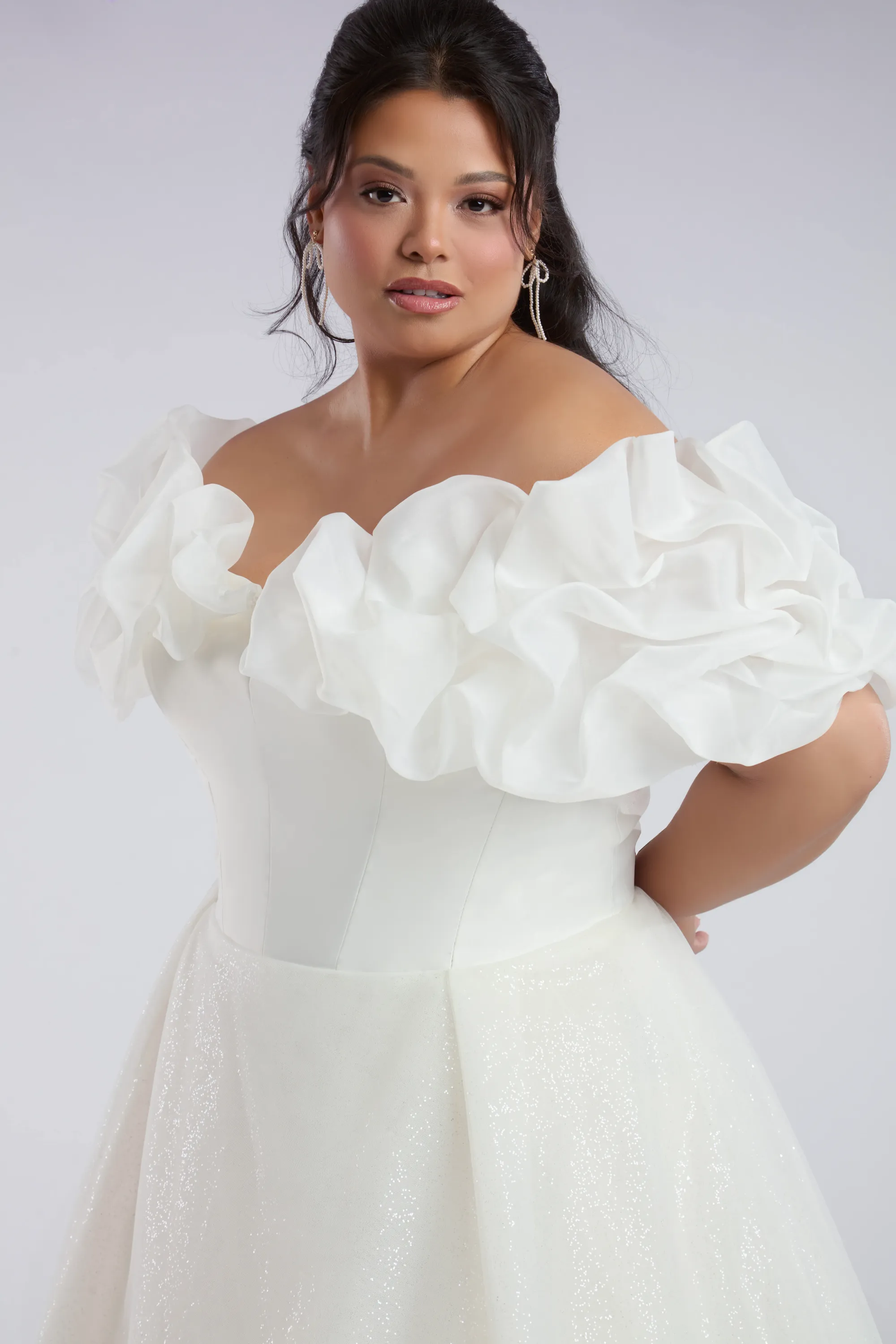 The Rosamund gown is a strapless ballgown that embodies pure romance. A structured organza bodice sits atop a full, floor-length tulle skirt, creating a voluminous silhouette that feels both timeless and enchanting. The straight neckline highlights the collarbone with subtle elegance, while a natural waistline enhances the figure before cascading into layers of soft ruffled tulle. Detachable off-the-shoulder sleeves add a touch of whimsy and versatility, allowing the bride to shift seamlessly from ceremony to celebration. Much like Rosamund herself, this wedding dress balances quiet refinement with an undeniable presence, ensuring every gaze lingers on the bride.