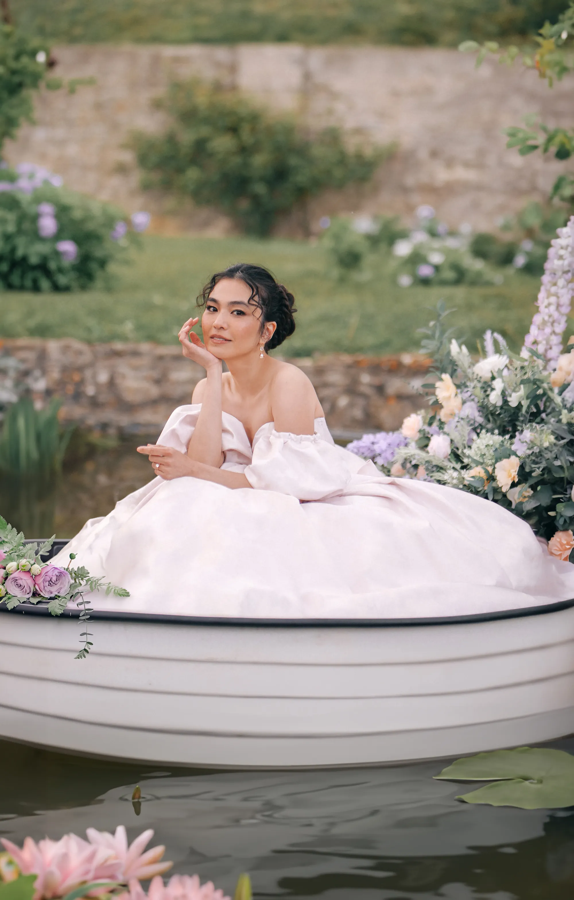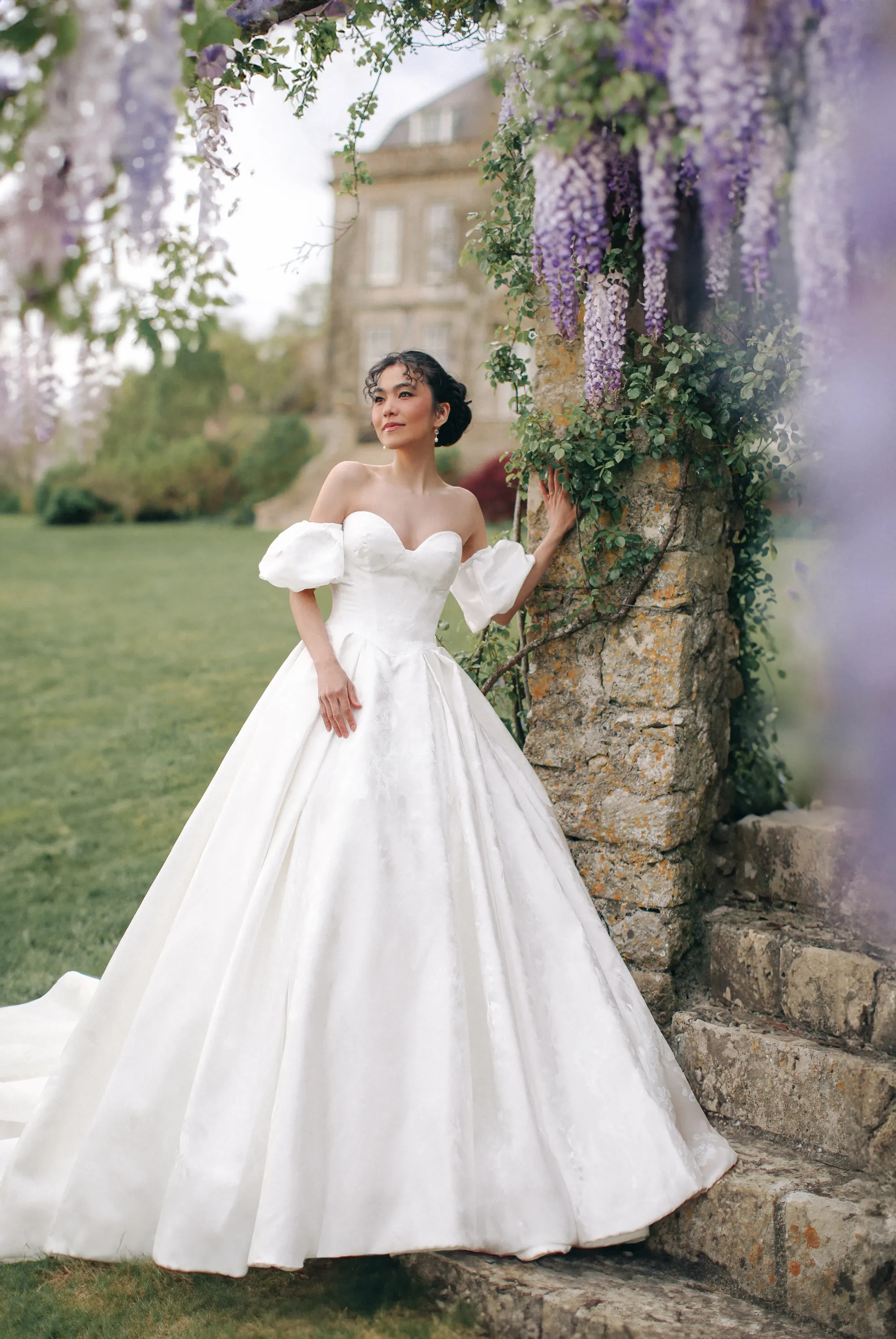 In soft rosewater painted satin, the Edwina gown is a strapless ballgown that radiates modern romance. The straight neckline and basque waist create a refined bridal silhouette, flowing into a voluminous floor-length satin skirt that moves with graceful elegance. A dramatic satin bow at the back adds a statement-making flourish, while detachable off-the-shoulder sleeves offer versatility from aisle to evening. Much like Edwina Sharma herself, this wedding dress embodies poise and beauty, ensuring the bride becomes the undeniable center of admiration.