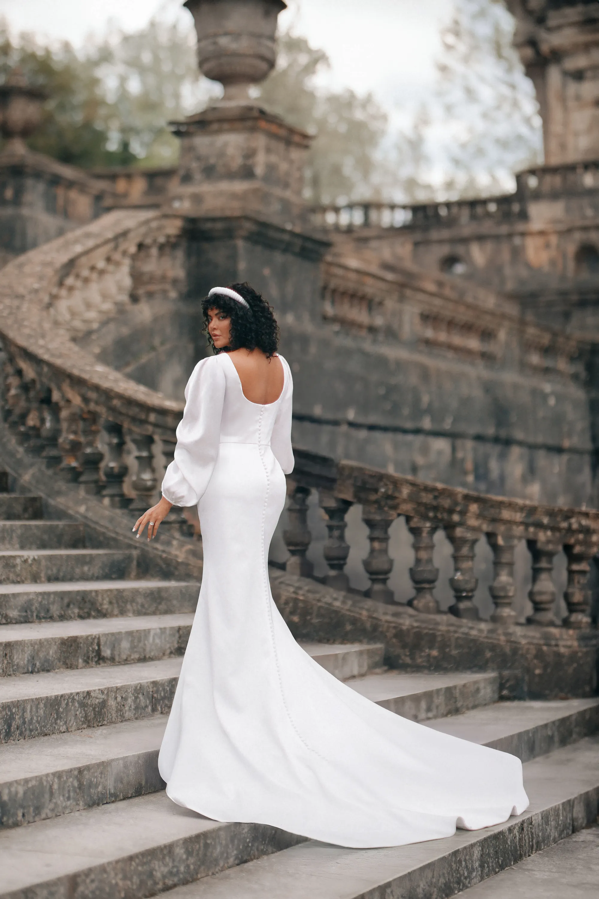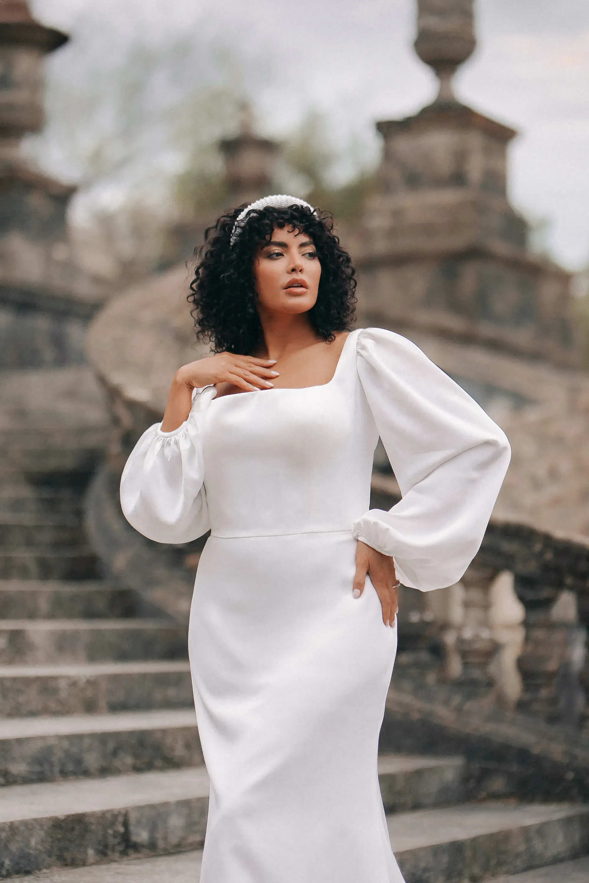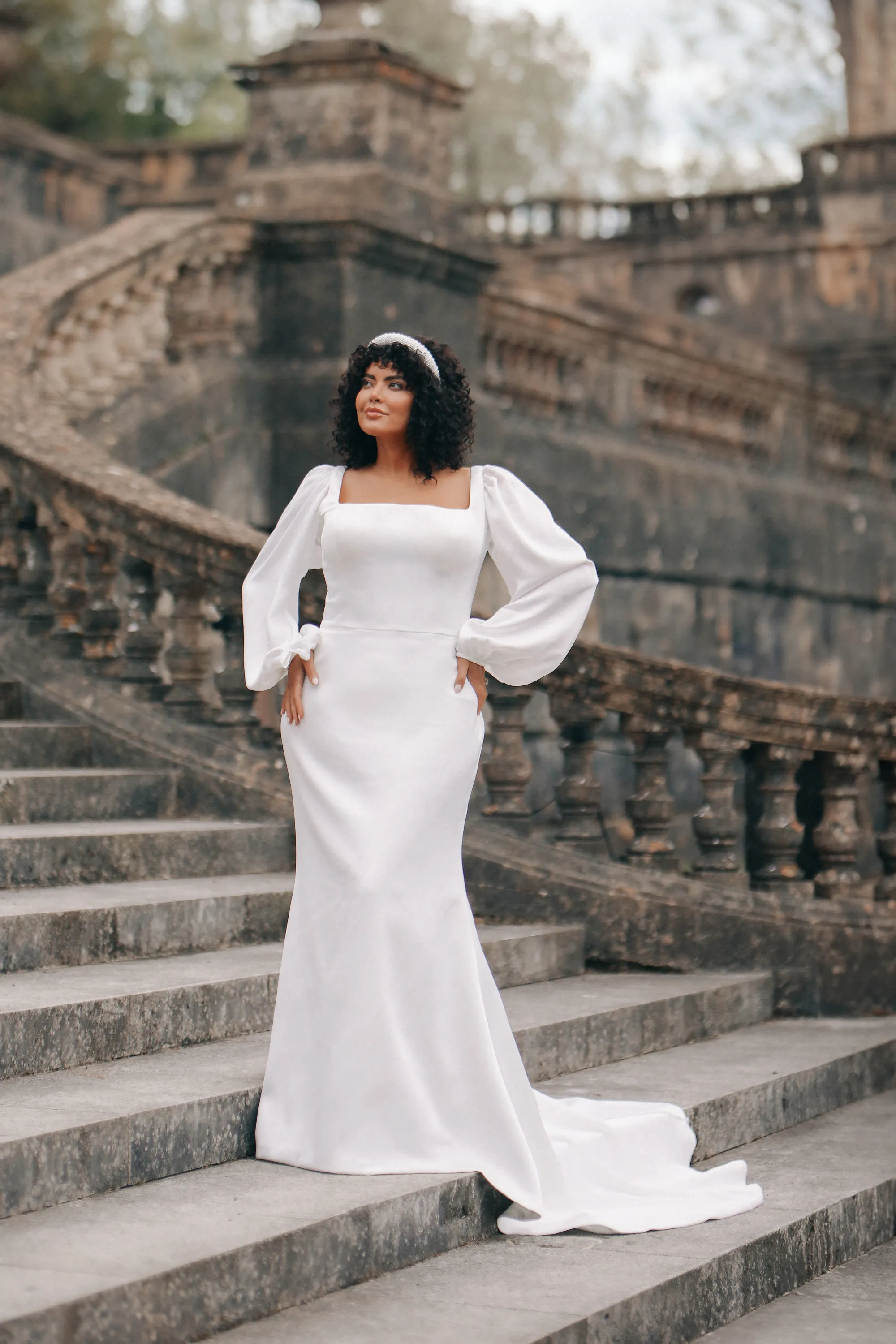 Understated elegance defines the Francesca gown, a sleek ivory satin sheath designed for the modern bride. The square neckline and natural waistline create clean, refined lines, while detachable long satin sleeves allow for versatile styling from ceremony to reception. Floor-length and effortlessly sophisticated, this satin wedding dress embodies quiet confidence and timeless grace. Much like Francesca Bridgerton herself, the gown carries a poised simplicity—unassuming at first glance, yet endlessly admired.