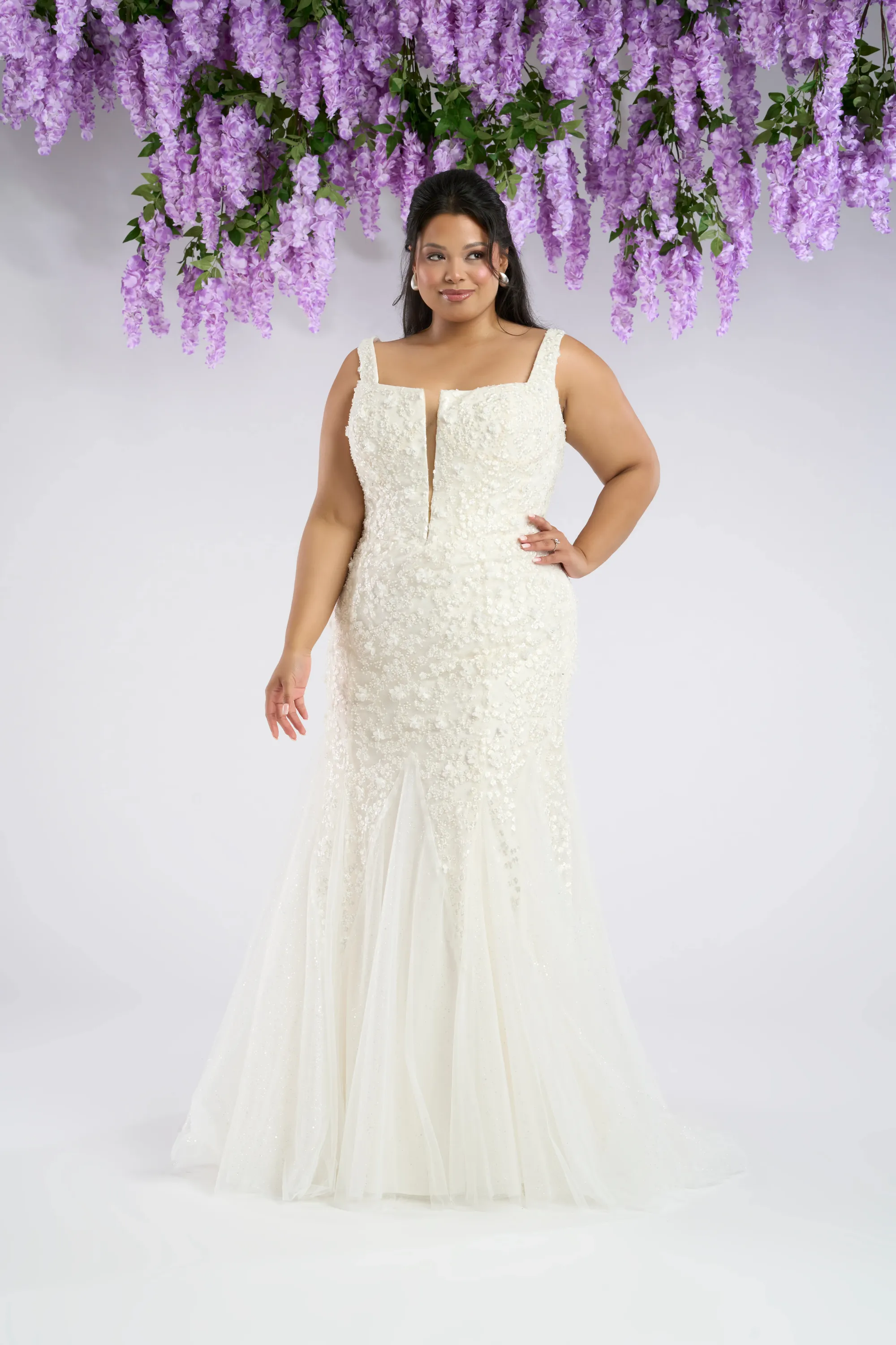 The Kate gown is a captivating fit-and-flare wedding dress in ivory and nude, designed with layers of glitter tulle and adorned with intricate beaded and sequin lace appliqués. A square neckline and natural waistline create a refined structure, while the sleeveless silhouette highlights the gown’s modern edge. The floor-length skirt flares elegantly from the hips, balancing sophistication with striking allure. Much like Kate Sharma herself, this bridal gown is bold yet graceful—radiant with strength, confidence, and undeniable romance, ensuring the bride leaves every onlooker enchanted.