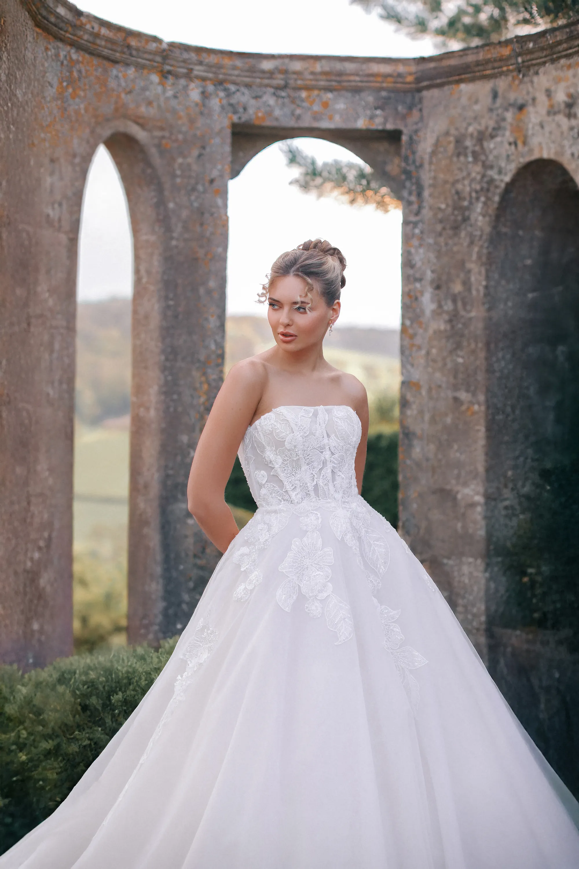 The Araminta gown is a romantic ballgown designed with layers of soft tulle and adorned with intricate beaded lace appliqués. A strapless bodice with a natural waistline flows into a full, floor-length skirt, creating a silhouette of timeless elegance. Detachable off-the-shoulder lace straps add versatility and a touch of whimsical charm, allowing the bride to transform her look with ease. Much like Araminta herself, this wedding dress balances refinement with a flair for drama—ensuring the bride captivates the admiration of every guest.