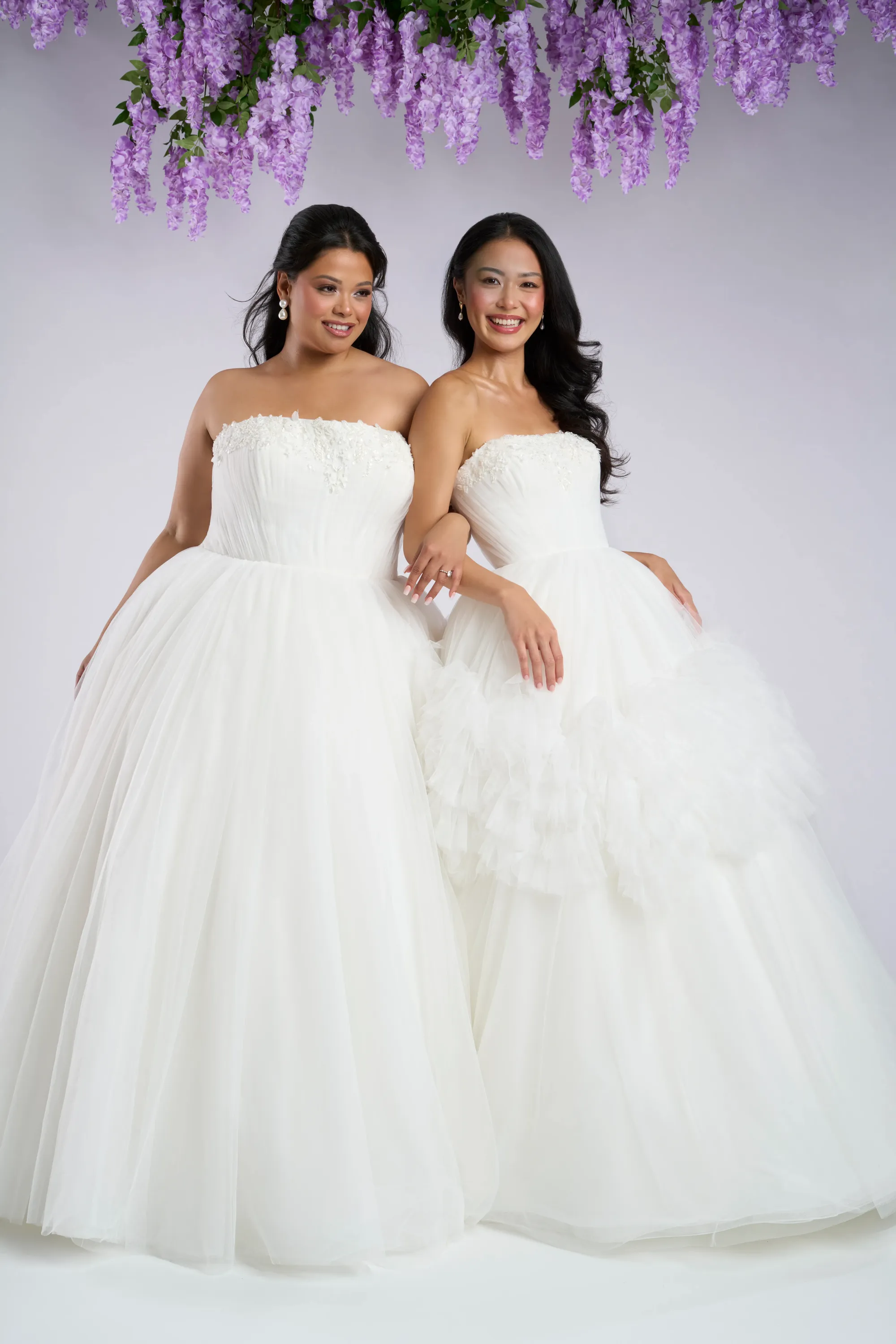 The Alice gown is a dazzling ballgown that captures both romance and grandeur. A strapless bodice is richly adorned with sequin and beaded lace appliqués, shimmering with light at every angle. From the natural waistline, layers of ruffled tulle cascade into a full, floor-length skirt, creating dramatic volume and movement. The combination of sparkle, texture, and classic silhouette makes this wedding dress both enchanting and unforgettable. Much like Alice herself, the gown radiates charm and quiet confidence—ensuring the bride shines with every step.